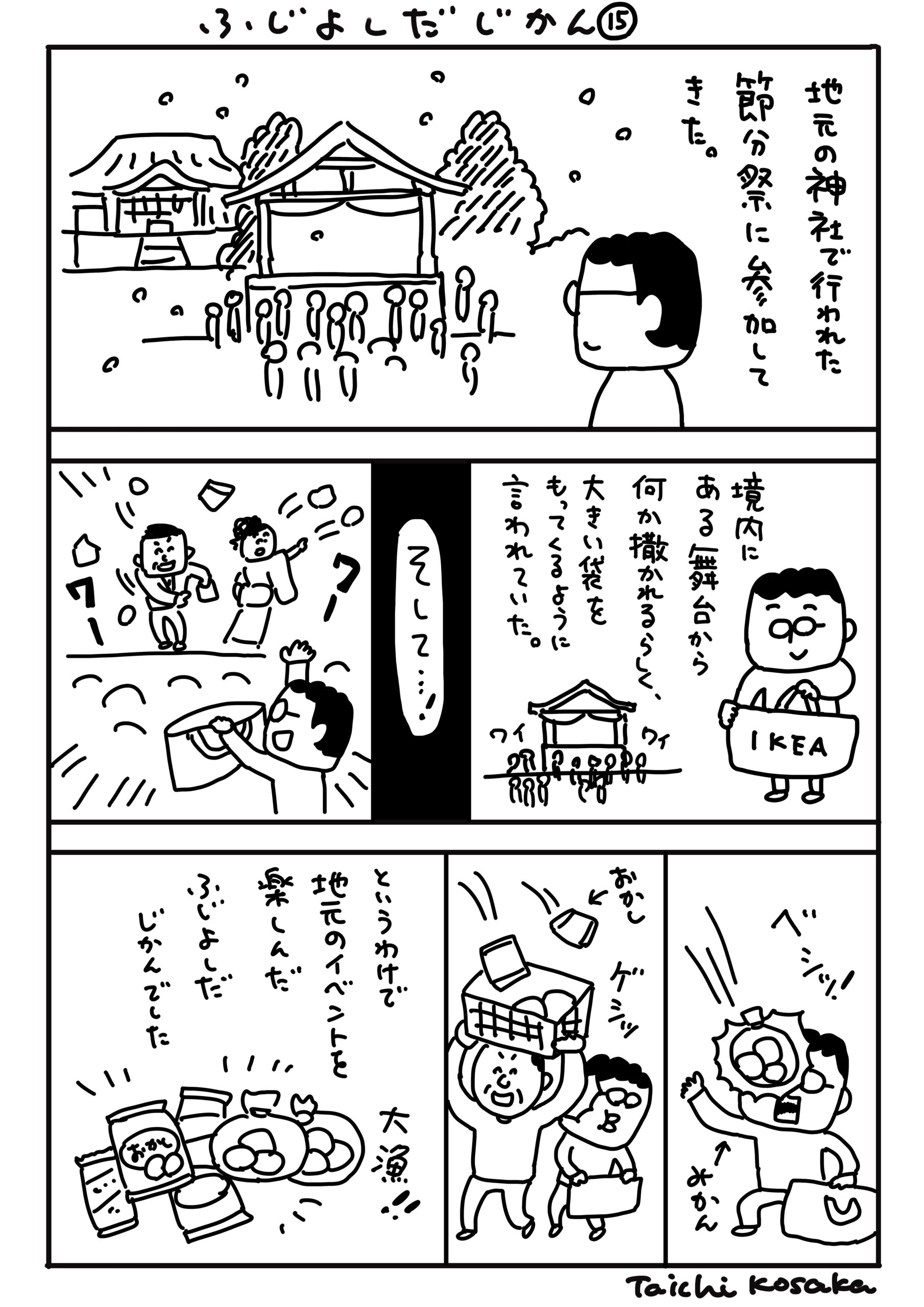 エッセイ漫画 2026.02.07 小坂 タイチ #ふじよしだじかん 節分祭 地元の知り合いにお誘いいただいて、節分祭に参加してきました。厄払いの意味を込めて、舞台からお菓子などを撒いて振る舞うようです。こういうのは初めてで楽しかった~ この記事が気に入ったら いいねしよう! 最新記事をお届けします。 最近よく読まれている記事 まだデータがありません。 もらって嬉しい請求書 オメェどこの寺だ!! 悪夢… がんばれ銭形平次 水飲ませてもらってもいいですか? コレ、絶対にルンバじゃないよね。 天体観測 もっと見る